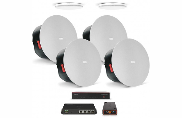 Biamp digital signal processors (DSP), beam-tracking microphones, and ceiling speakers provide clear voice capture and balanced audio distribution across the room. Advanced acoustic echo cancellation ensures remote participants hear conversations clearly without distortion or background noise